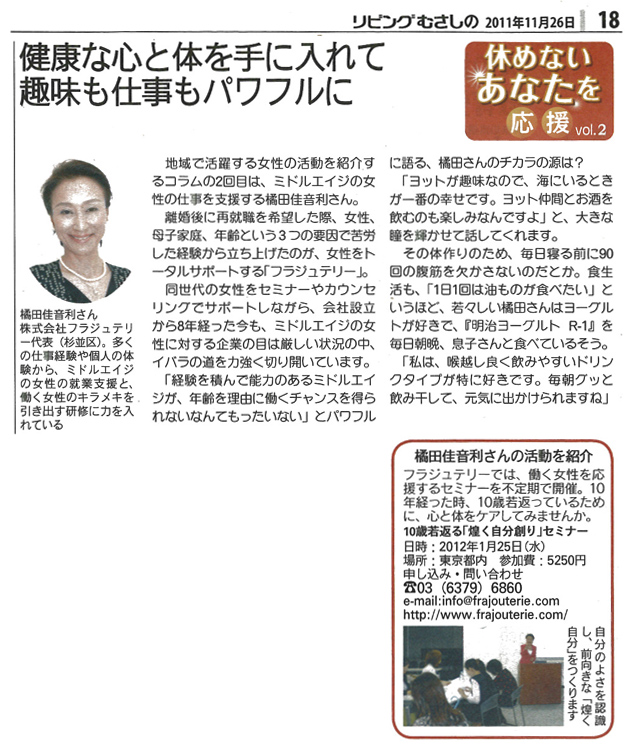 11.5日発売「AERA」2012.11.12日号に、橘田佳音利が就職を成功させるための本音アドバイスをさせていただいております。「主婦が、仕事を、探すということ。」東洋経済新報社刊の本が紹介されました。
