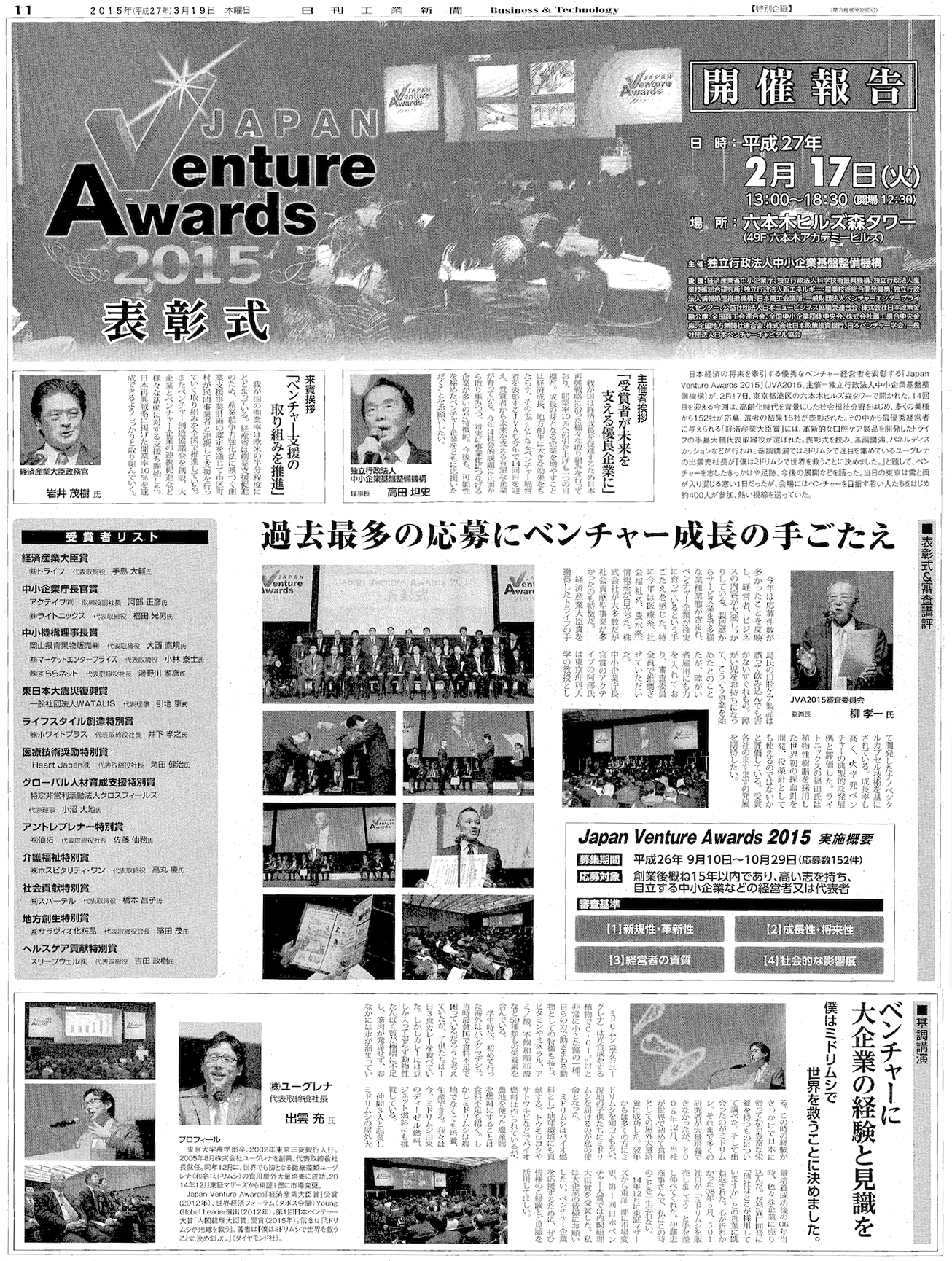 Japan Venture Award 2015の表彰式が2月17日に行われました。