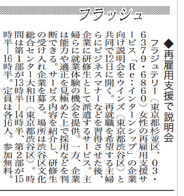 主婦の再就職をしっかりサポート Re:インターンシップ事業が紹介されました。