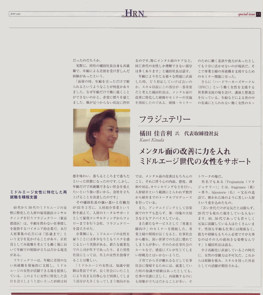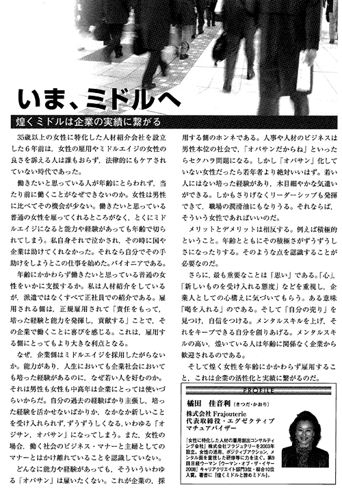 弊社が、マチュア世代の雇用創出ビジネスにおけるパイオニア企業として取り上げられました。~「マチュア」と企業を結ぶことで雇用創出を~弊社代表取締役 橘田佳音利が語ります。